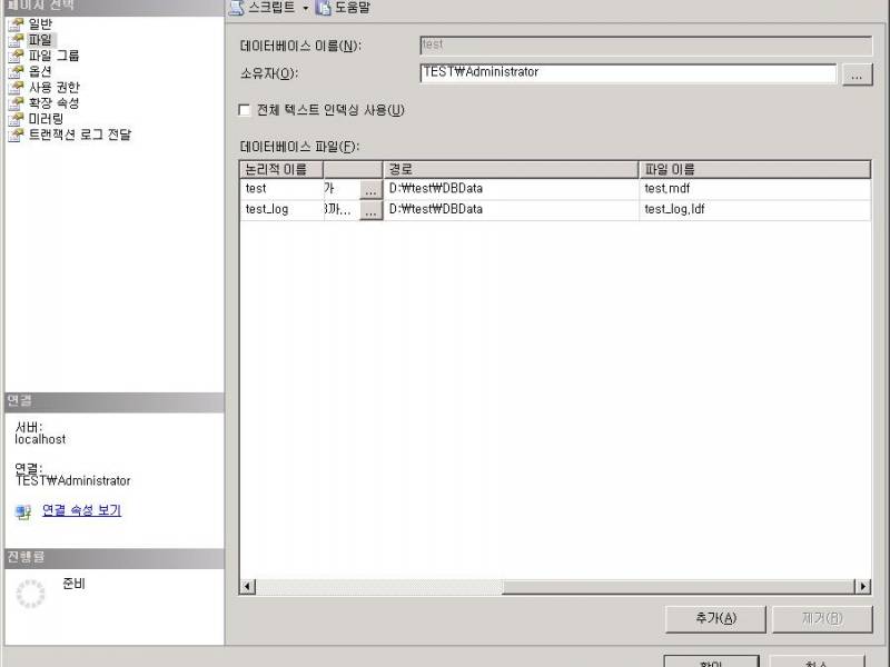 | test 데이타베이스의 데이타파일 | D:\test\DBData\test.mdf |