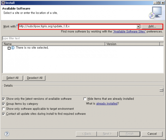 원하는 Subclipse 버젼의 URL을 복사한다.