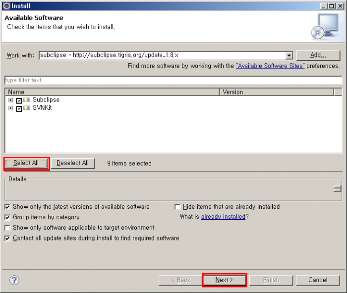 Subclipse 설치되는 화면을 보실 수 있습니다.