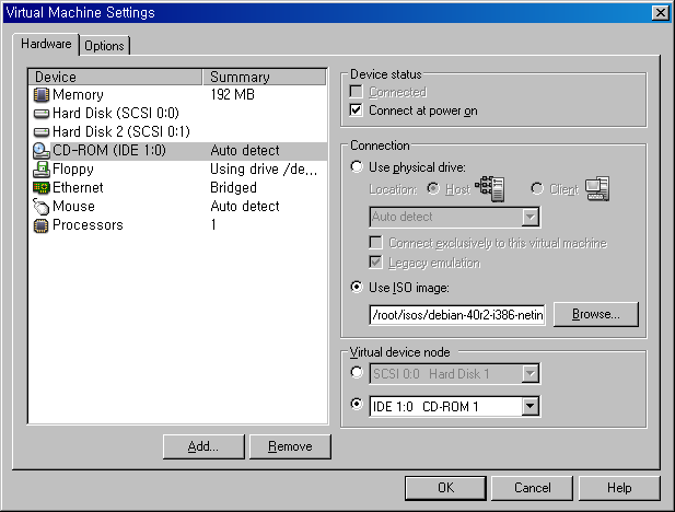 CD-ROM 을 선택하고, Use ISO Image 에서 Debian 설치 iso 파일을 선택하고, OK 버튼을 눌러 마칩니다.