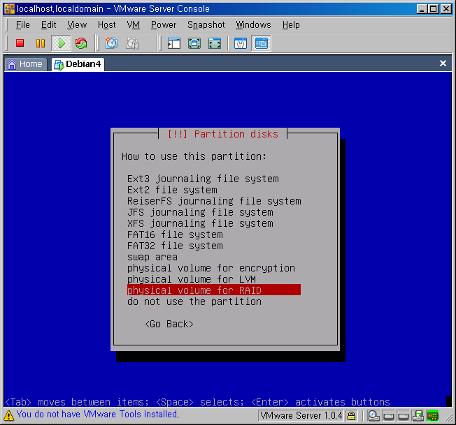 physical volume for RAID 를 선택하고 엔터를 칩니다.