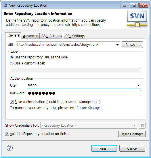 SVN Repositories 창에서 마우스 오른쪽 버튼으로 새로운 Repository 등록